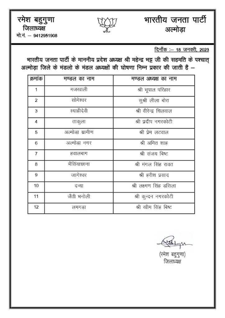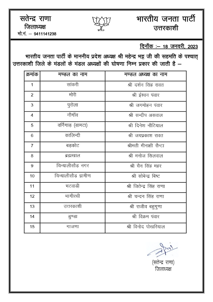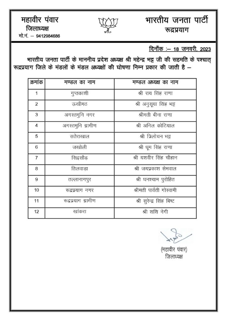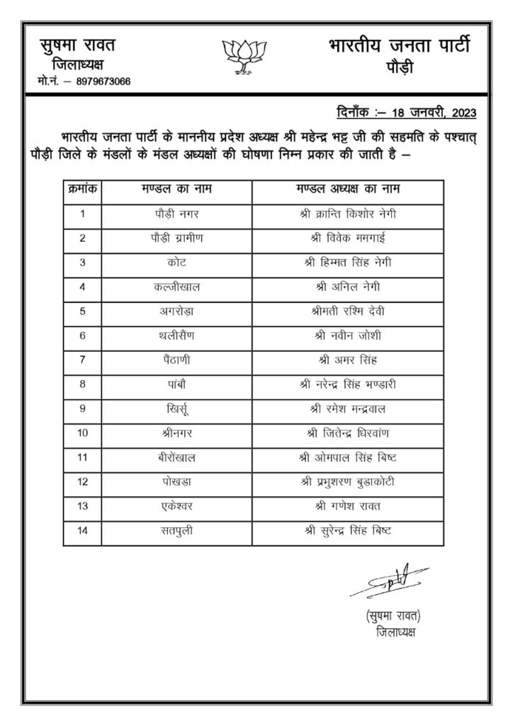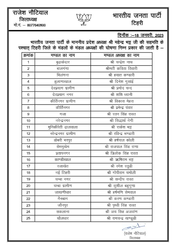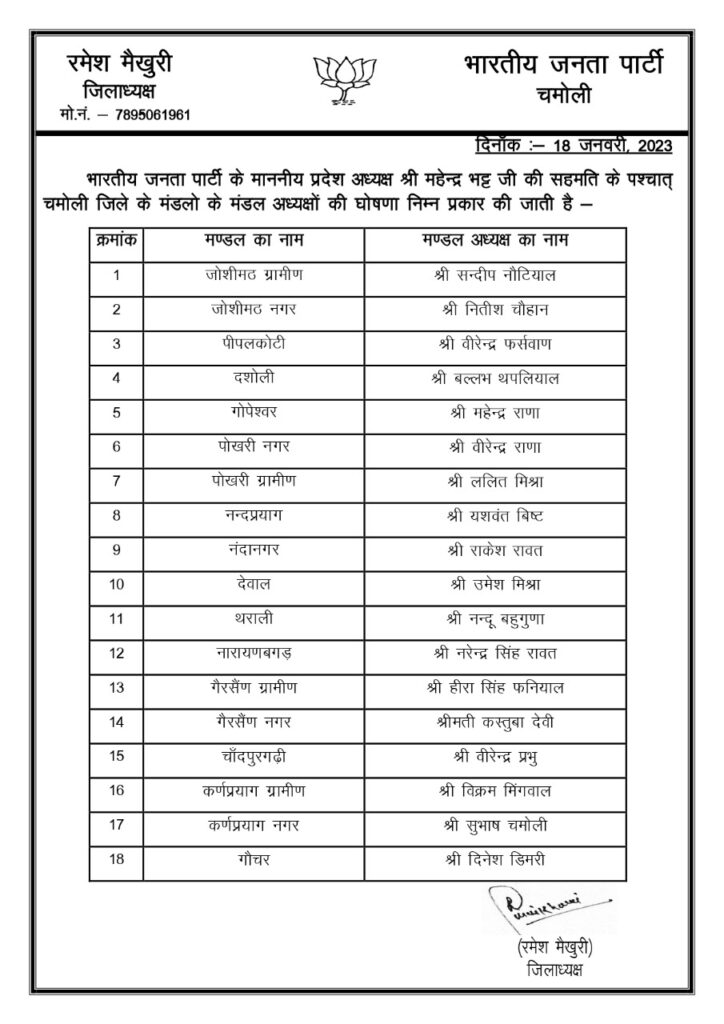 राजनैतिक समीक्षा भाजपा ने 14 जिलों के मंडल अध्यक्षों की घोषणा की, जानिए पूरी सूची । India Review January 18, 2023 देहरादून 18 जनवरी, भाजपा प्रदेश अध्यक्ष श्री महेंद्र भट्ट की सहमति से पार्टी के 14 सांगठनिक जिलों में मंडल अध्यक्षों के नाम की घोषणा हो गयी है । संबंधित जिला अध्यक्षों द्वारा जारी की गई सूची इस प्रकार से है About Post Author India Review See author's posts Tags: bjp announce mandal adhyaksh Continue Reading Previous: दरोगाओं का निलंबन, कांग्रेस के कारनामों की तस्वीर : चौहानNext: गलतियों के लिए कांग्रेस निकाले जनता के सामने हाथ जोड़ो यात्रा : भट्ट Leave a Reply Cancel replyYour email address will not be published. Required fields are marked *Comment * Name * Email * Website Save my name, email, and website in this browser for the next time I comment. Related Stories माणा गाँव में देवभूमि सांस्कृतिक महोत्सव का भव्य समापन राजनैतिक समीक्षा माणा गाँव में देवभूमि सांस्कृतिक महोत्सव का भव्य समापन October 27, 2025 पिछले तीन साल में 23 करोड़ से अधिक पर्यटक पहुंचे उत्तराखं राजनैतिक समीक्षा पिछले तीन साल में 23 करोड़ से अधिक पर्यटक पहुंचे उत्तराखं October 27, 2025 धामी सरकार के चार वर्ष : उपलब्धियाँ और विकास की दिशा* राजनैतिक समीक्षा धामी सरकार के चार वर्ष : उपलब्धियाँ और विकास की दिशा* October 26, 2025