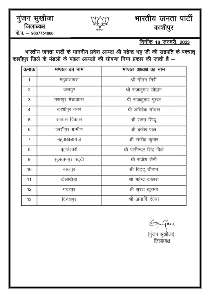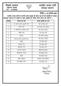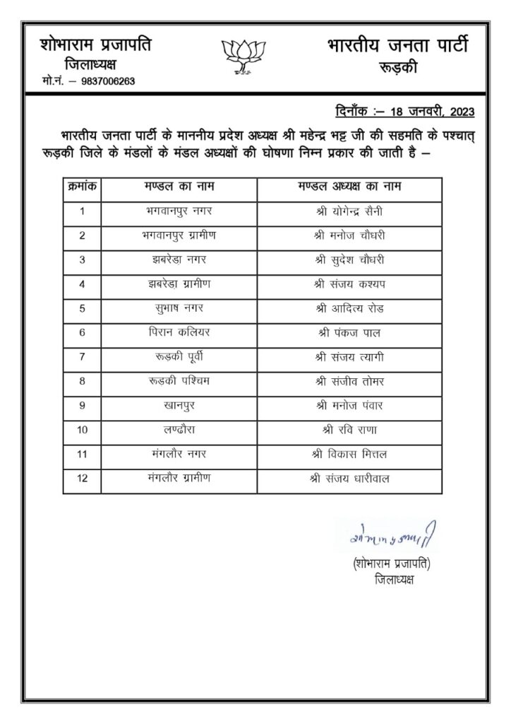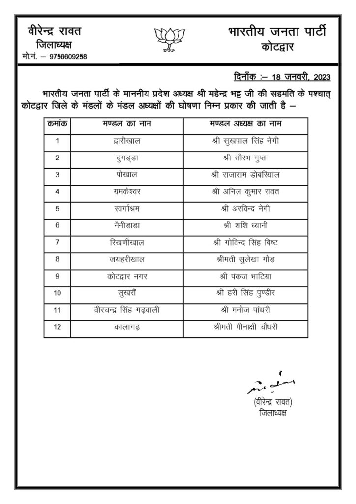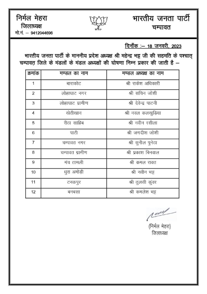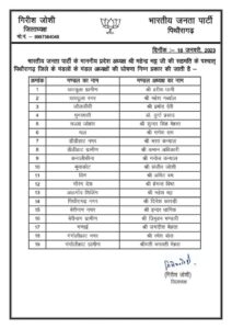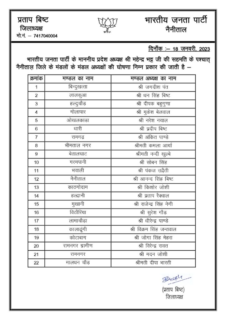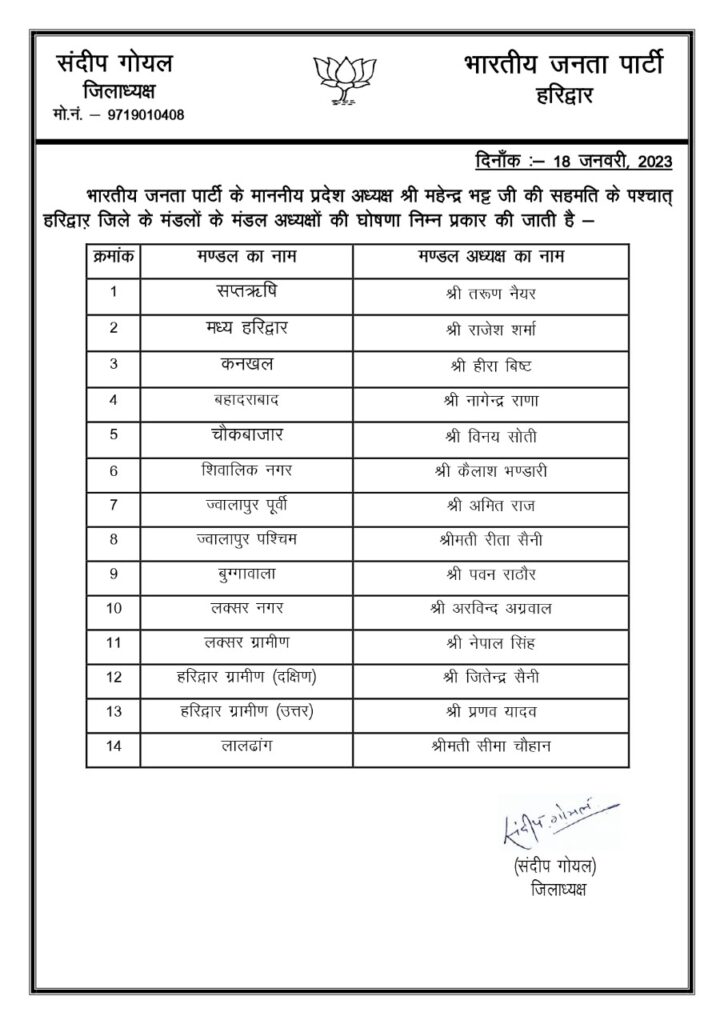 राजनैतिक समीक्षा भाजपा ने 14 जिलों के मंडल अध्यक्षों की घोषणा की, जानिए पूरी सूची । India Review January 18, 2023 देहरादून 18 जनवरी, भाजपा प्रदेश अध्यक्ष श्री महेंद्र भट्ट की सहमति से पार्टी के 14 सांगठनिक जिलों में मंडल अध्यक्षों के नाम की घोषणा हो गयी है । संबंधित जिला अध्यक्षों द्वारा जारी की गई सूची इस प्रकार से है About Post Author India Review See author's posts Tags: bjp announce mandal adhyaksh Continue Reading Previous: दरोगाओं का निलंबन, कांग्रेस के कारनामों की तस्वीर : चौहानNext: गलतियों के लिए कांग्रेस निकाले जनता के सामने हाथ जोड़ो यात्रा : भट्ट Leave a Reply Cancel replyYour email address will not be published. Required fields are marked *Comment * Name * Email * Website Save my name, email, and website in this browser for the next time I comment. Related Stories माणा गाँव में देवभूमि सांस्कृतिक महोत्सव का भव्य समापन राजनैतिक समीक्षा माणा गाँव में देवभूमि सांस्कृतिक महोत्सव का भव्य समापन October 27, 2025 पिछले तीन साल में 23 करोड़ से अधिक पर्यटक पहुंचे उत्तराखं राजनैतिक समीक्षा पिछले तीन साल में 23 करोड़ से अधिक पर्यटक पहुंचे उत्तराखं October 27, 2025 धामी सरकार के चार वर्ष : उपलब्धियाँ और विकास की दिशा* राजनैतिक समीक्षा धामी सरकार के चार वर्ष : उपलब्धियाँ और विकास की दिशा* October 26, 2025