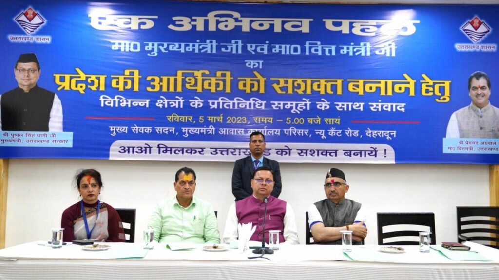देहरादून। मुख्यमंत्री पुष्कर सिंह धामी ने मुख्यमंत्री आवास स्थित मुख्य सेवक सदन में प्रदेश की आर्थिकी को सशक्त बनाने के लिये कृषि, बागवानी, उद्योग, व्यापार आदि समूह के प्रतिनिधियों से संवाद कर उनके सुझाव एवं विचारों से अवगत हुए। मुख्यमंत्री ने कहा कि हम सबको मिलकर उत्तराखण्ड को सशक्त राज्य बनाने का संकल्प लेना होगा।