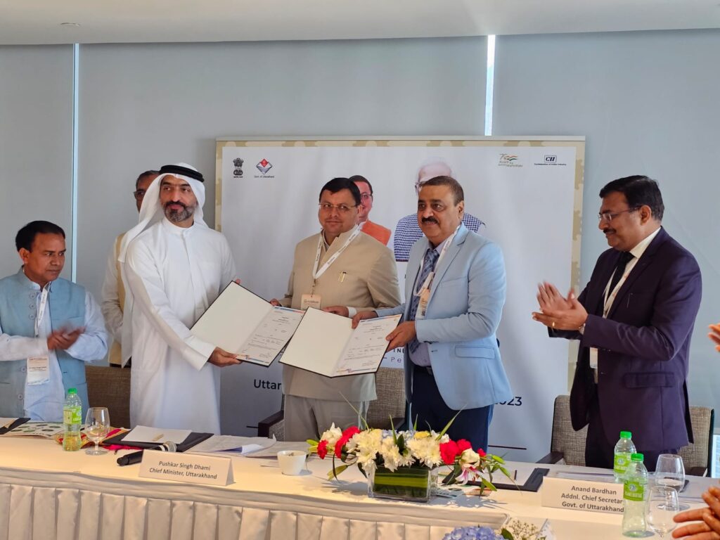 दुबई/देहरादून। उत्तराखण्ड ग्लोबल इन्वेस्टर समिट 2023 हेतु दुबई में आयोजित रोड शो में मुख्यमंत्री पुष्कर सिंह धामी ने मंगलवार को विभिन्न उद्योग समूहों के प्रतिनिधियों के साथ बैठक की। मुख्यमंत्री की उपस्थिति में दुबई में पहले दिन विभिन्न उद्योग समूहों के साथ ₹11925 करोड़ के इनवेस्टमेंट एमओयू साइन किए जा चुके हैं। मुख्यमंत्री पुष्कर सिंह धामी ने सभी उद्योग घरानों को आगामी 8 एवं 9 दिसम्बर माह में देहरादून में आयोजित होने वाले समिट हेतु निमत्रण भी दिया। इस दौरान मुख्यमंत्री धामी के साथ कैबिनेट मंत्री डा. धनसिंह रावत भी मौजूद हैं।
