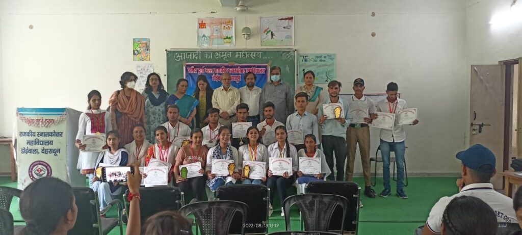 देहरादून । डोईवाला डिग्री कॉलेज के मनोविज्ञान विभाग द्वारा आजादी का अमृत महोत्सव मनाया गया। शहीद दुर्गामल राजकीय स्नातकोत्तर महाविद्यालय डोईवाला में मनोविज्ञान विभागीय परिषद द्वारा “आजादी के अमृत महोत्सव” के उपलक्ष में पोस्टर प्रस्तुतीकरण प्रतियोगिता का आयोजन किया गया । प्रतियोगिता के निर्णायक के रूप में डॉ. त्रिभुवन चंद्र खली (जंतु विज्ञान विभाग), डाॅ एन.डी.शुक्ला(सैन्य विज्ञान विभाग) तथा डॉ. नूर हसन (इतिहास विभाग) उपस्थित रहे। पोस्टर प्रस्तुतीकरण प्रतियोगिता में छात्र-छात्राओं उत्साह के साथ प्रतिभाग किया। प्रतियोगिता के अंत में निर्णायक मंडल द्वारा परिणामों की घोषणा की गई जिसमें अंजलि (M.A.4th sem) , उत्तम बडोनी(M.A.2nd sem) ने प्रथम स्थान, सुरेखा राणा(M.A.4th sem),अंशिका(M.A.2nd sem), अतुल (M.A.2nd sem) ने द्वितीय स्थान तथा मनीषा (M.A.2nd sem) ने तृतीय स्थान प्राप्त किया।कार्यक्रम का आयोजन मनोविज्ञान विभाग द्वारा किया गया।