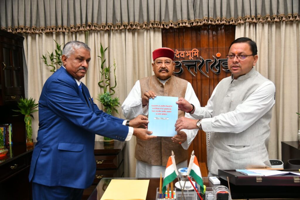 देहरादून। उत्तराखण्ड के स्थानीय निकायों में अन्य पिछड़ा वर्ग के आरक्षण हेतु एकल सदस्यीय समर्पित आयोग के अध्यक्ष न्यायमूर्ति ब्रह्म सिंह वर्मा ने मंगलवार को मुख्यमंत्री कैम्प कार्यालय में आयोग का प्रथम प्रतिवेदन मुख्यमंत्री पुष्कर सिंह धामी को सौंपा। इस अवसर पर पंचायतीराज अधिकारियों के साथ प्रदेश के पंचायतीराज मंत्री सतपाल महाराज भी उपस्थित रहे।