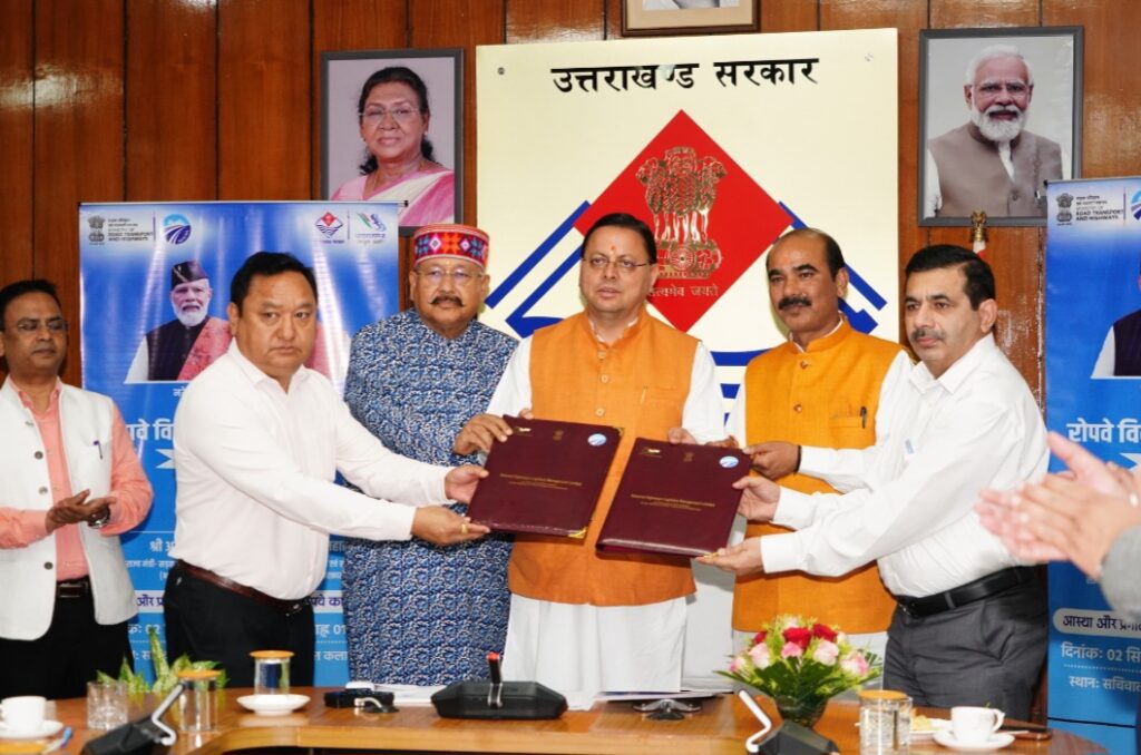 देहरादून। मुख्यमंत्री पुष्कर सिंह धामी की उपस्थिति में सचिवालय में पर्वतमाला परियोजना के अन्तर्गत केदारनाथ और हेमकुंड साहिब में रोपवे के विकास के लिए राज्य सरकार और नेशनल हाईवे लॉजिस्टिक्स मैनेजमेंट लिमिटेड (एनएचएलएमएल) के बीच समझौता हुआ। इस समझौते के अन्तर्गत इक्विटी भागीदारी में एनएचएलएमएल की 51 प्रतिशत और राज्य सरकार की 49 प्रतिशत हिस्सेदारी होगी। राजस्व साझेदारी के अन्तर्गत 90 प्रतिशत धनराशि उत्तराखण्ड राज्य में पर्यटन, परिवहन एवं गतिशीलता के क्षेत्र में व्यय की जायेगी। इस समझौते के अवसर पर राज्य मंत्री सड़क परिवहन एवं राजमार्ग, भारत सरकार अजय टम्टा एवं उत्तराखण्ड के पर्यटन मंत्री सतपाल महाराज भी उपस्थित थे।
