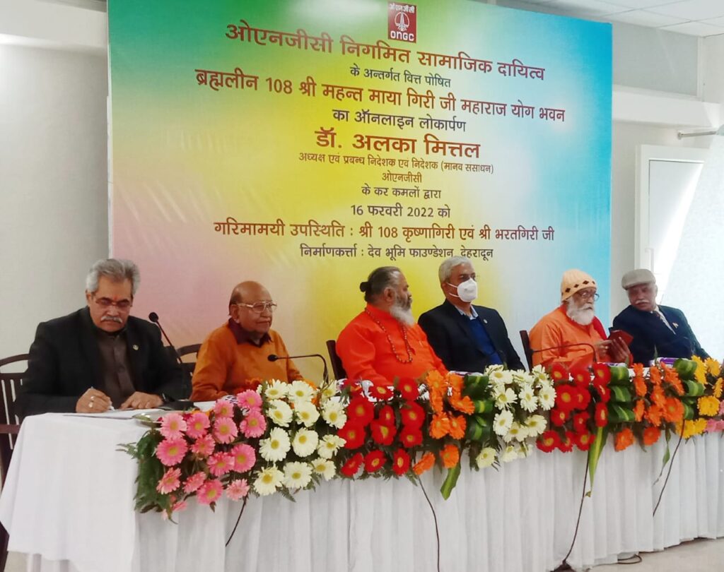 योग भवन का लोकार्पण ओएनजीसी की अध्यक्ष एवं प्रबंध निदेशक महोदया डॉ. अलका मित्तल जी के कर-कमलों द्वारा सीएसआर प्रभारी श्री सोमेश रंजन, महंत श्री कृष्णागिरि महाराज एवं श्री महंत भरतगिरि महाराज प्रधान निगमित प्रशासन, देहरादून विजय राज, प्रभारी सीएसआर देहरादून, रामराज द्विवेदी एवं समिति पदाधिकारी अशोक मिश्रा, एस. एस. गोयल की गरिमामयी उपस्थिति में आभासी (वर्चुअल) माध्यम से किया गया ।